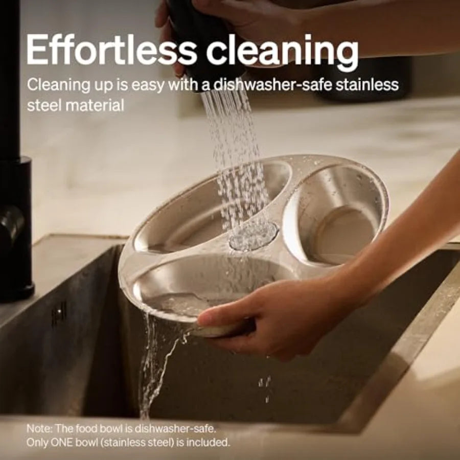 - The stainless steel bowl reduces clinking and is easy to sanitize, while a built-in water dispenser keeps hydration close at hand.