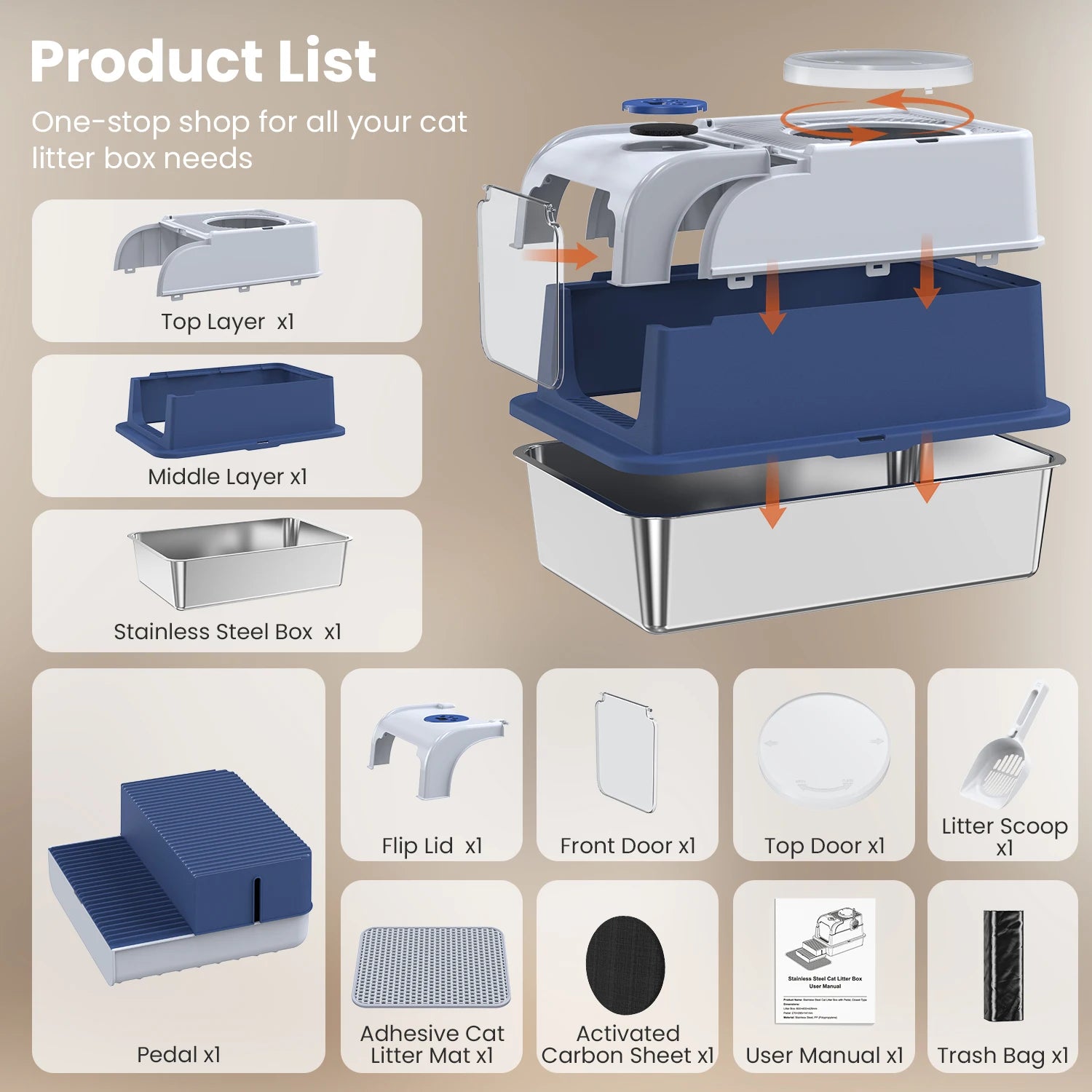 - 1.3-in-1 multifunctional design combines a stainless steel litter box, a double-layer step for litter storage and a trash bag holder, plus an anti-scatter mat to reduce litter tracking and a low entry for short-legged or elderly cats.
